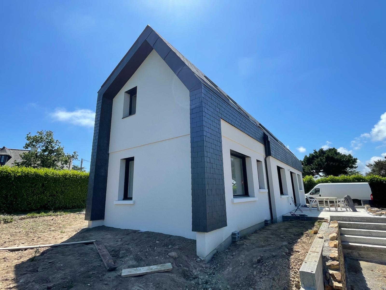 Réalisation d'un chantier en ardoises avec couverture et façade d'une maison sur Pordic.