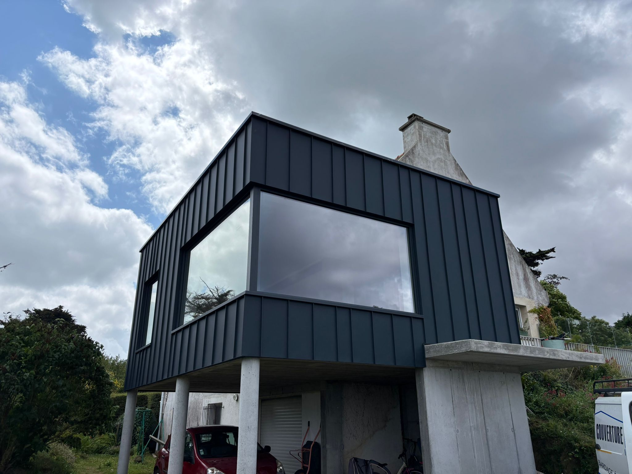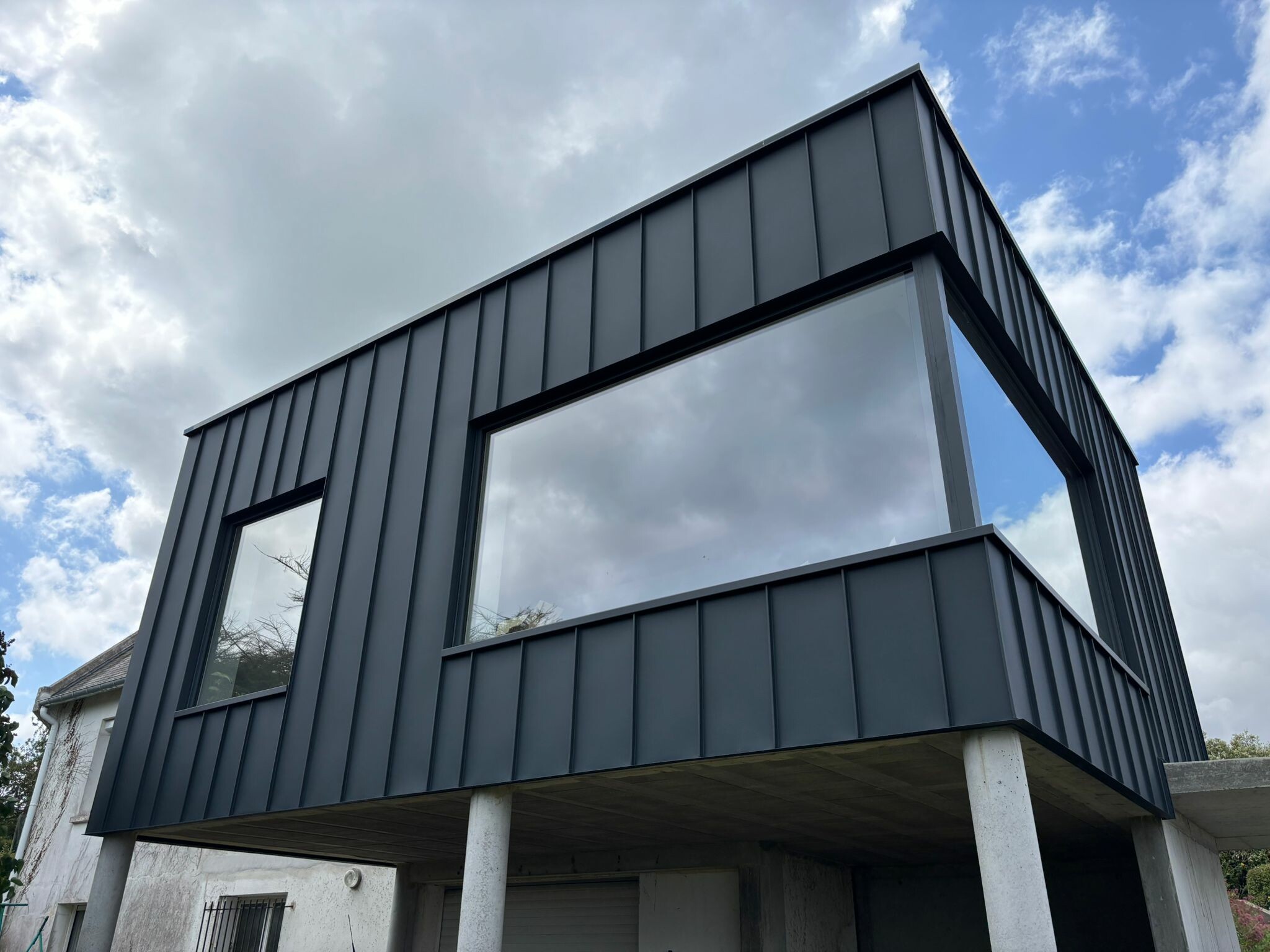 Réalisation d'un bardage à joint debout en aluminium gris anthracite. Ce type de pose offre un rendu soigné avec des lignes verticales épurées, parfaitement adaptées aux constructions modernes.