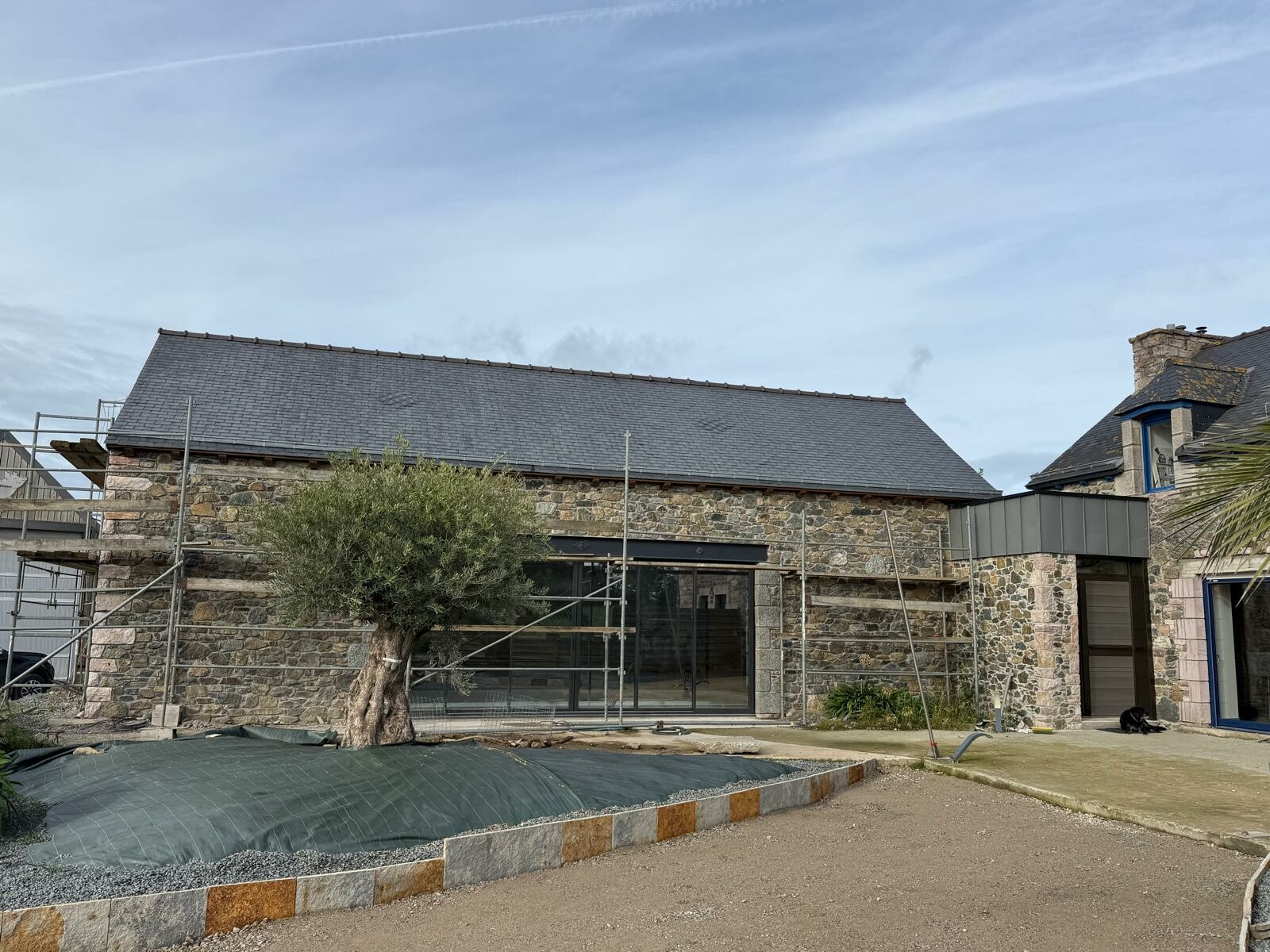 Intervention à Plurien pour la rénovation d'une couverture d'une maison en pierre.
